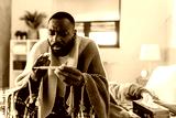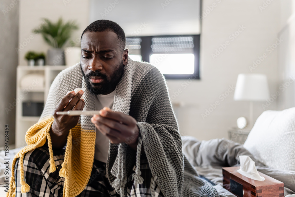 A sick man wrapped in a warm blanket sits on his bed, checking his temperature with a thermometer while holding a handkerchief. His concerned expression highlights feelings of illness and discomfort.