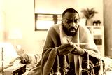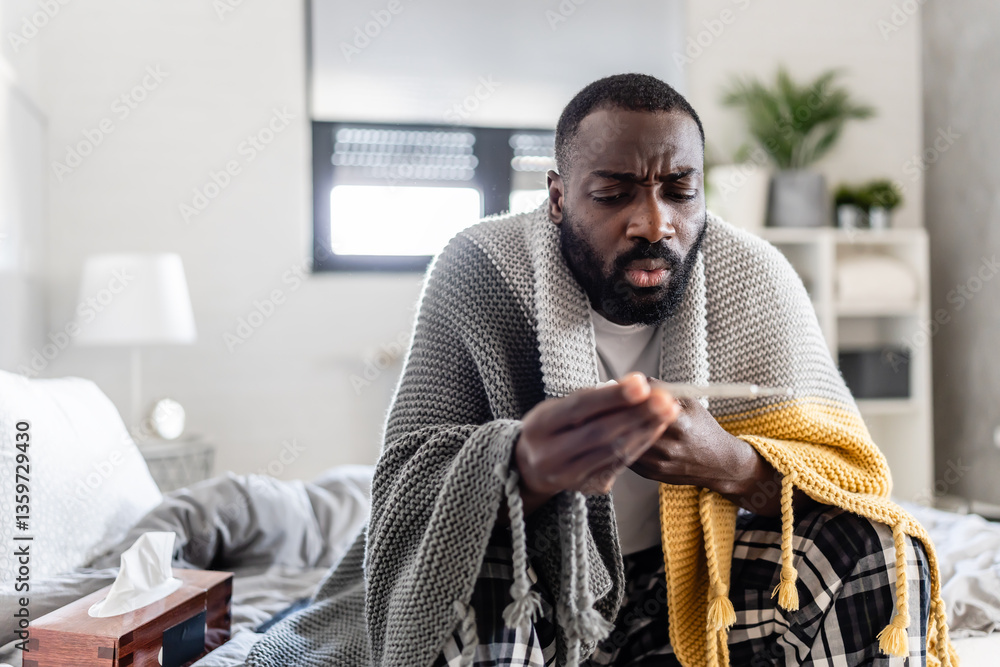 A sick man wrapped in a warm blanket sits on his bed, checking his temperature with a thermometer while holding a handkerchief. His concerned expression highlights feelings of illness and discomfort.