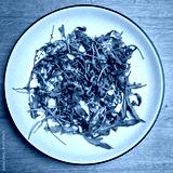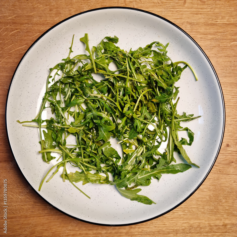 A top-down shot of a white plate filled with fresh arugula leaves, placed on a wooden table, showcasing the green leafy vegetable in its simplicity