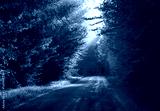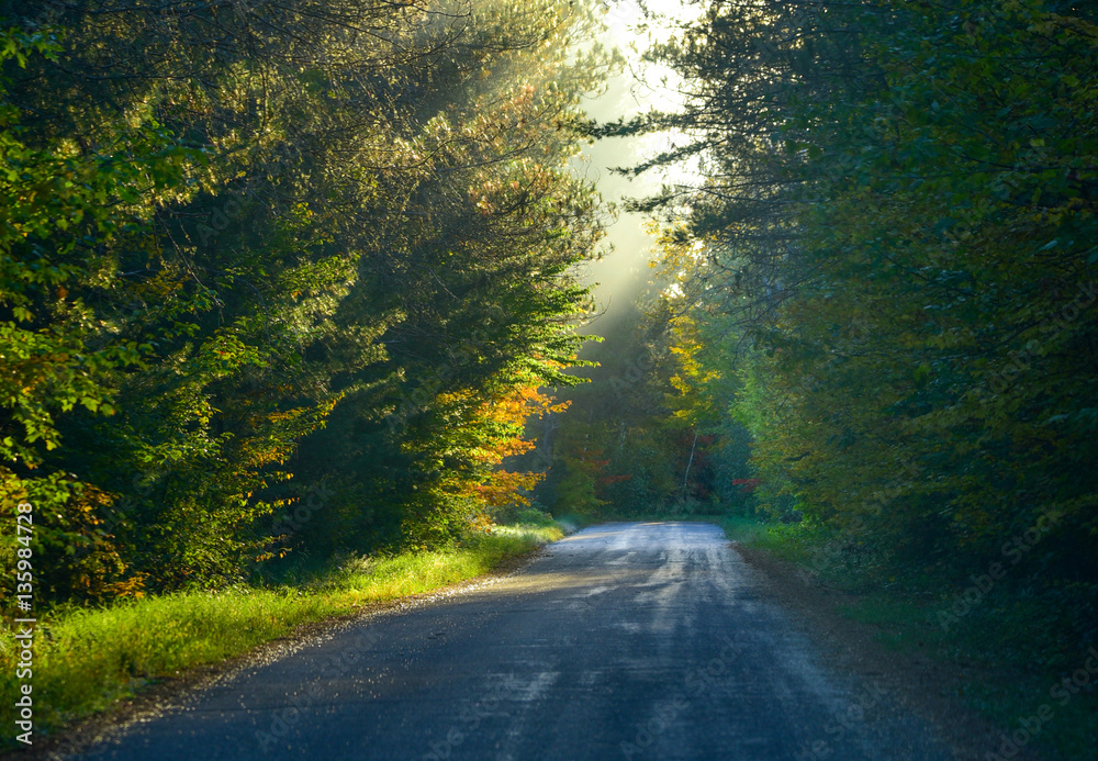 Bright sun shines softly on a forest over shady wooded road. Single point perspective down tree-lined narrow road in midst of a mixed specie Ontario forest.