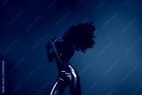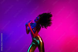 Young woman singing passionately under vibrant neon lights in a night club setting