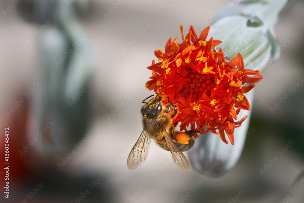 Westliche Honigbiene (Apis mellifera) mit gefülltem Pollenhöschen an einer sich gerade öffnenden Kleinia galpinii Blüte - Fataga, Gran Canaria