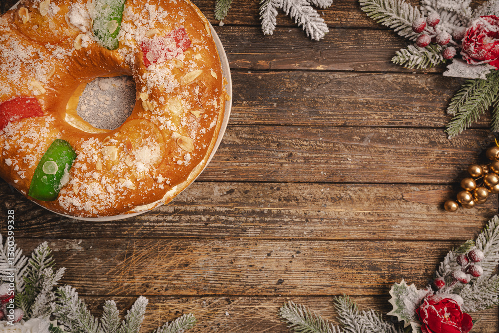 Roscon de reyes with cream and christmas ornaments on a wooden background, top view. Roscon is a traditional Spanish Christmas pastry cake with decoration. Kings day concept spanish three kings cake.