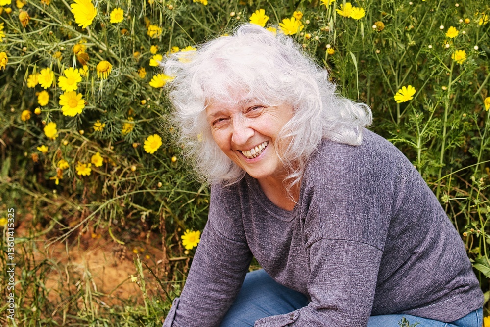 Portrait of an elderly gray-haired lady against the background of a flowering meadow.