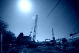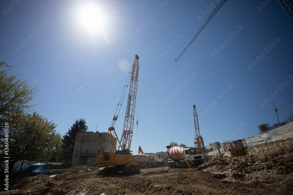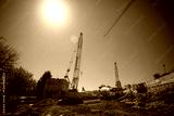 A busy construction site with heavy machinery working efficiently under bright sunlight
