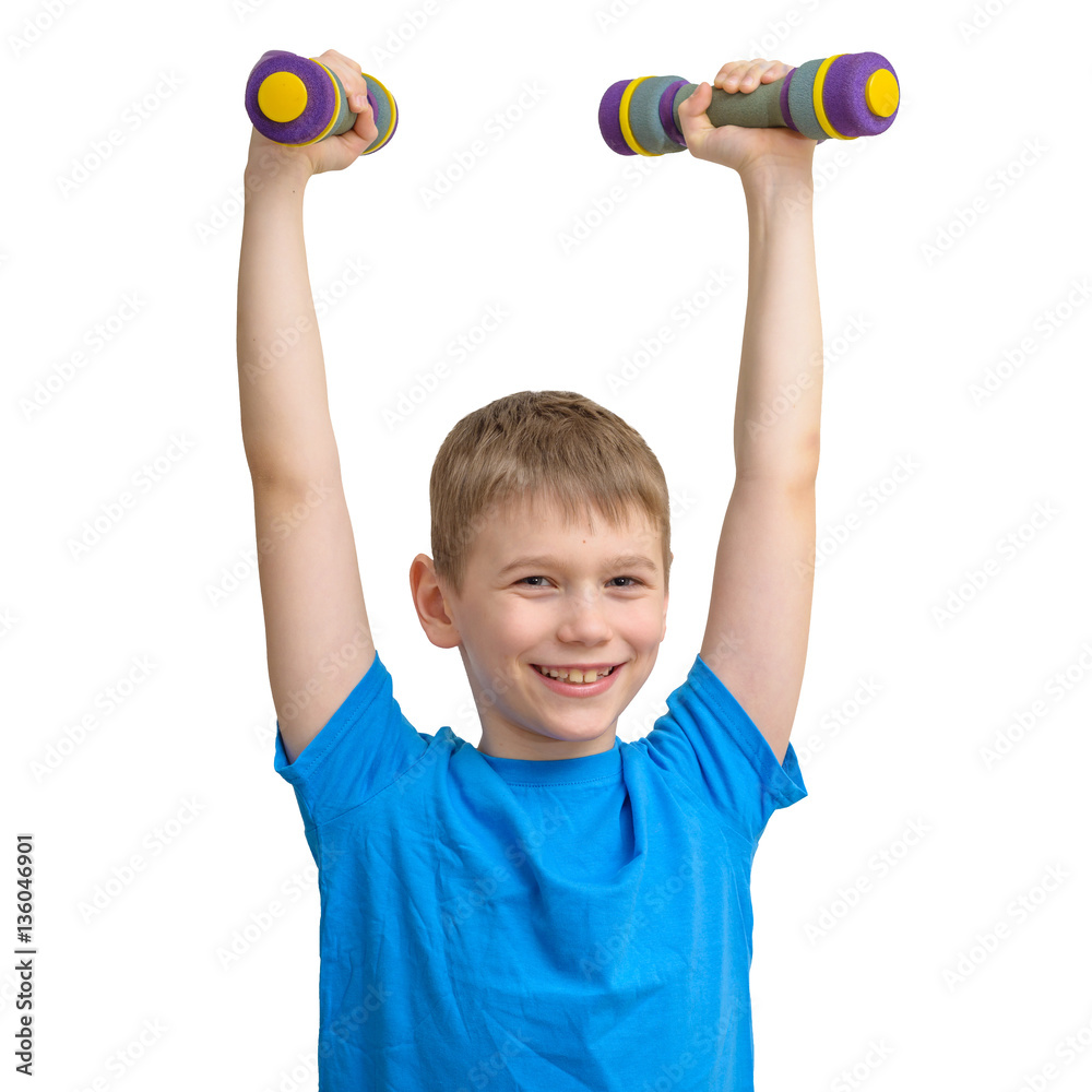 Smiling cute sport boy exercising with dumbbells isolated on white.