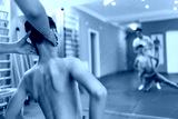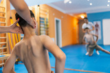 Therapeutic exercise kinesitherapy of little boy. Spine straightening, scoliosis. Doctor helping him.