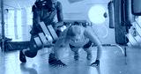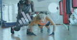 African American trainer coaching woman doing push-ups, digital interface overlay