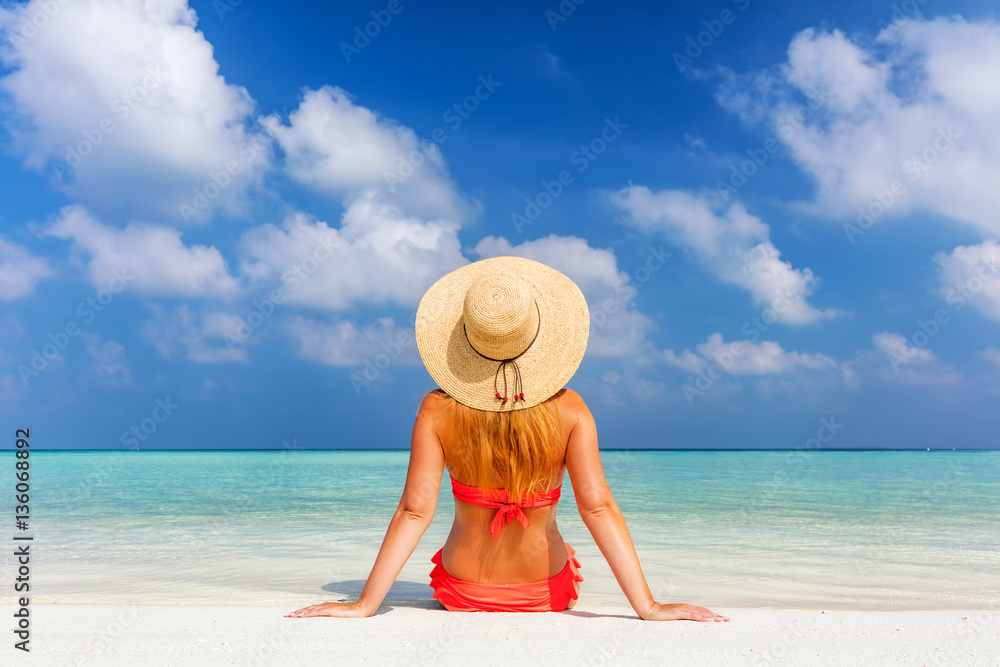 Beautiful young woman in sunhat sitting relaxed on tropical beach in Maldives