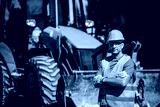 Construction worker stands confidently in front of a yellow excavator on a bright sunny day at a construction site