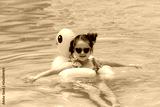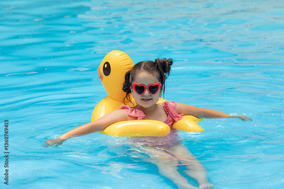 A little girl in sunglasses swims in an outdoor pool hugging an inflatable duckling. Sea holidays on vacation. Pretty female child smiles and swims along with inflatable yellow duck-shaped circle.