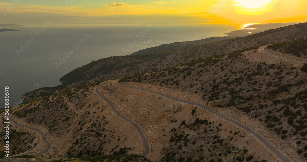 AERIAL: Winding coastal mountain road with the glowing sea reflecting golden light. Scenic view of hairpin turns at an asphalt roadway that cuts the steep rugged terrain of a hilly Croatian island.