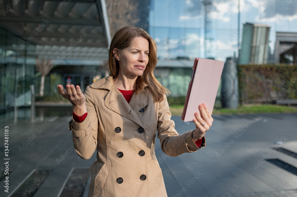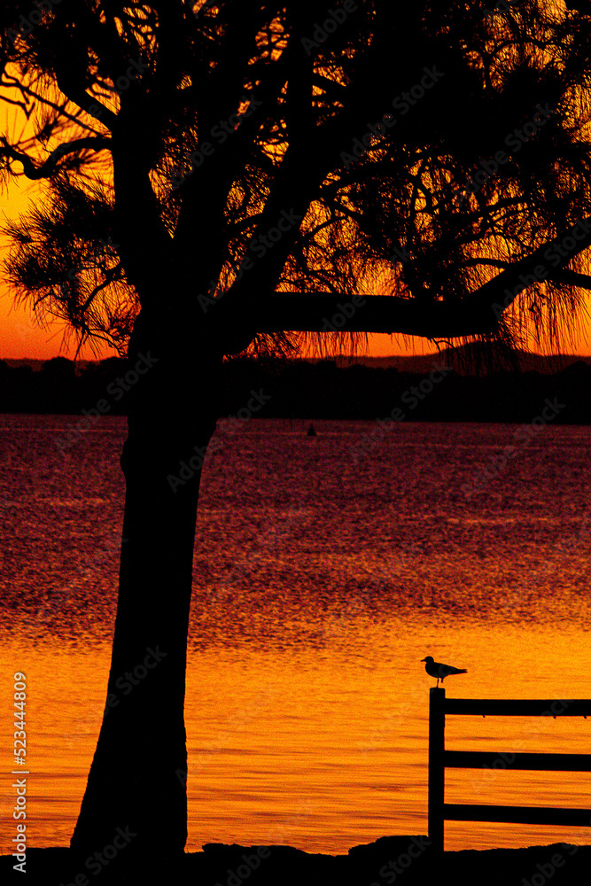 AERIAL: Cheerful woman walks her dog along a sunlit hillside above blue sea during golden hour. Warm evening light casts a serene glow on the dry grass and wildflowers. Joy of a summer walk in nature.