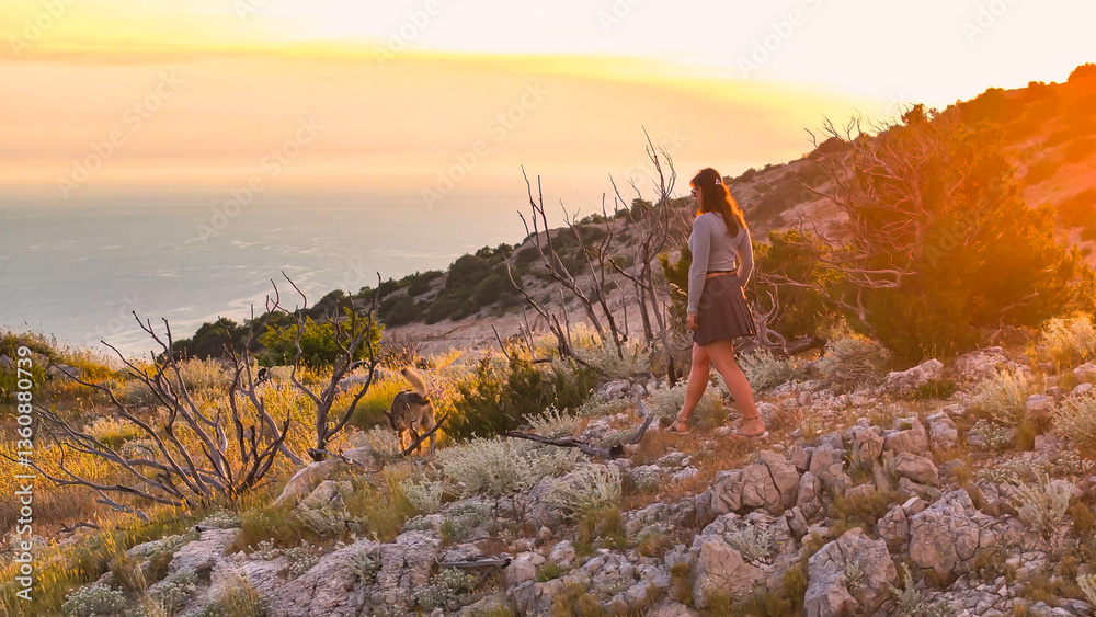 AERIAL, LENS FLARE: Woman and her dog walk a rugged mountain ridge bathed in the golden light of sunset. Young adventurer explores rugged landscape of a Croatian island with her loyal doggo by side.