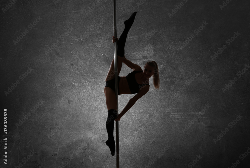 Young pole dancer on gray background