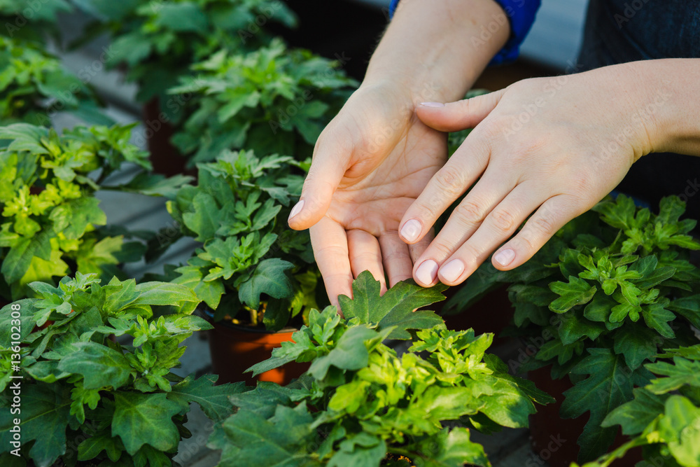 commercial cultivation houseplants in a greenhouse. female hands taking care of plant, close-up