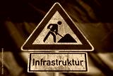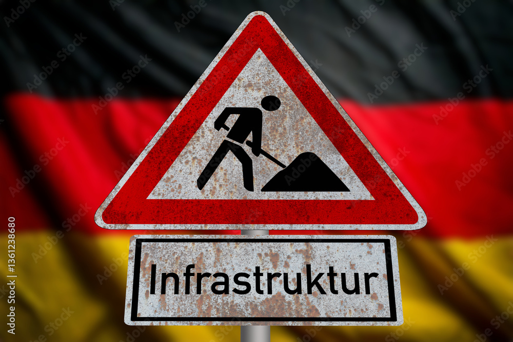 Deutsche Flagge und Verkehrsschild Baustelle als Symbol für die Erneuerung der Infrastruktur in Deutschland
