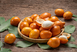 Fresh Achacha fruit or garcinia intermedia in wooden bowl on wooden background, Yellow Madrono Fruit or Lemon drop mangosteen in wooden basket on wooden texture background.