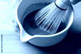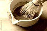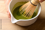 Matcha green tea powder mixing with water in tea bowl by using chasen