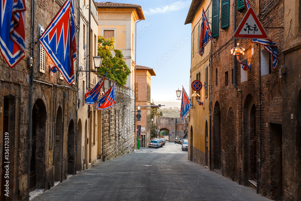 Banners of the contrads on Medieval scenic street in Siena. Feast Palio. Region of Tuscany, Italy