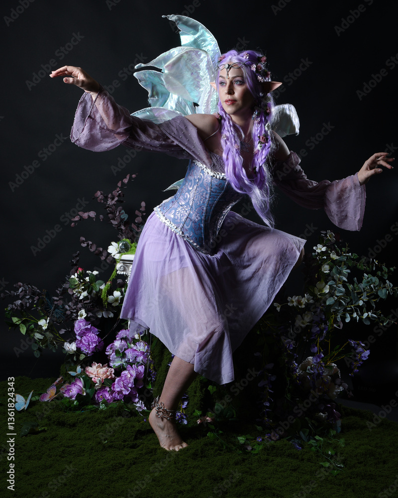 full length portrait of pretty female model wearing fantasy elf costume with fairy wings and purple dress. sitting pose on magical dark studio background with romantic mossy flowers.