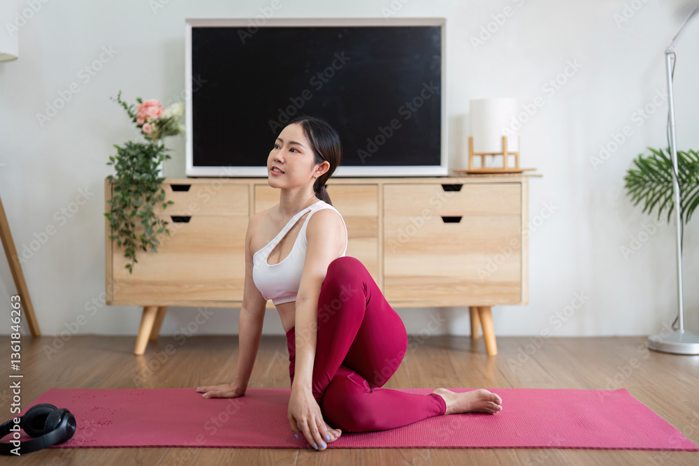 Yoga and Stretching. A woman performing a yoga twist, enhancing flexibility and strength in a calming environment.