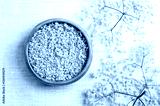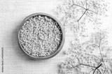 Dried elderflowers in a wooden bowl on linen fabric, with dried corymbs on the right. Elderflower tea, Flos Sambuci, blossoms of European black elder, Sambucus nigra, used in in traditional medicine.
