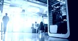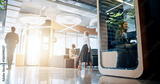 Lobby, cubicle and business people in office in morning with meeting for collaboration, teamwork and discussion. Professional, corporate and privacy with woman in workspace pods for productivity