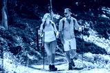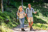 A couple enjoys hiking together in nature on a sunny summer day. They walk along a trail, taking in the beautiful surroundings and sharing smiles and laughter.