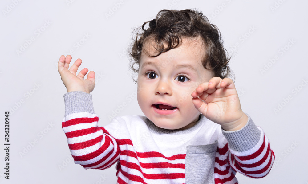Cute baby boy crying raising his hands up.Little child in pain, suffering, teething, refusing and crying. Cute sad baby throwing a tantrum. Baby wants up in the arms to be held.