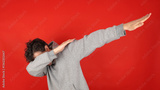 Happy man in casual making dab arms gesture on blank red studio background, funny white guy dabbing moving in internet meme pose celebrating victory having fun, dance school or triumph concept