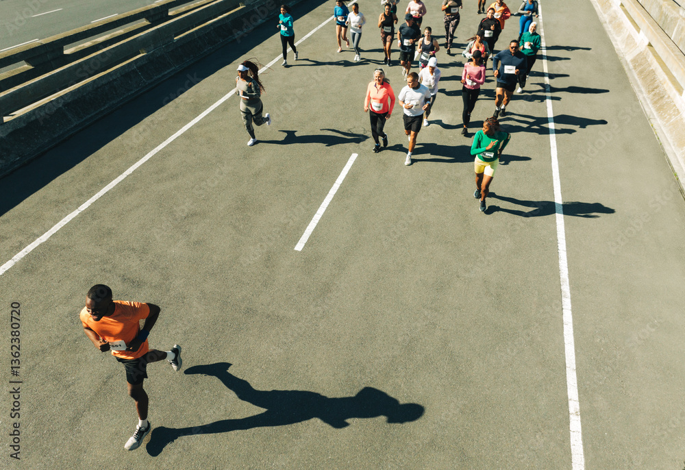 Male runner leading a group marathon on city street