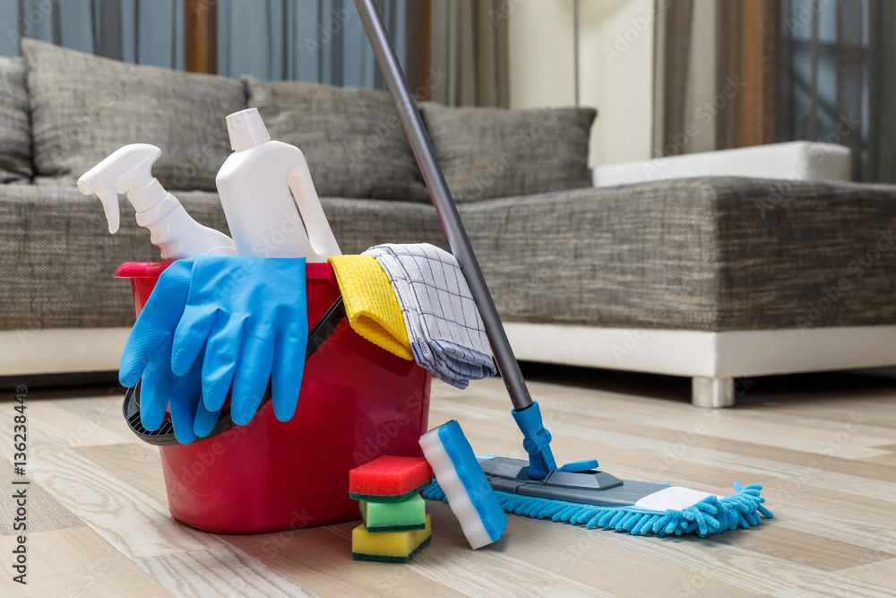 Cleaning service. Bucket with sponges, chemicals bottles and mopping stick. Rubber gloves and towel. Household equipment.