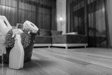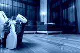 Cleaning service. Bucket with chemicals bottles and rubber gloves. Paper towel. Household equipment.