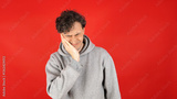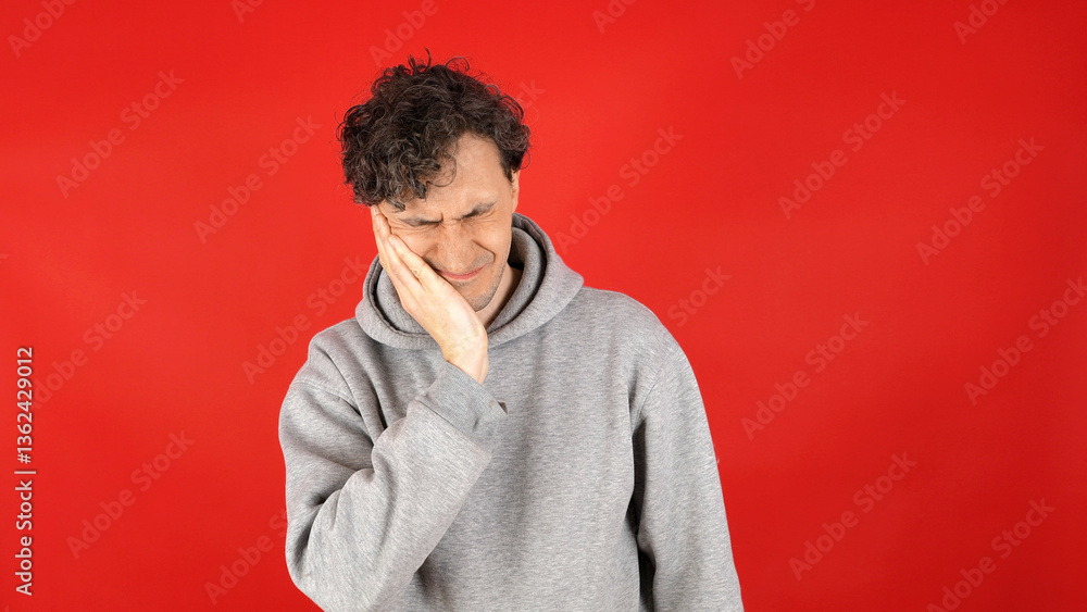 young, unhappy man curly haired brunette in gray hoodie holds cheek with hand, suffers from toothache in mouth. Isolated on red studio background. Concept - dentistry, dental treatment, caries, wisdom