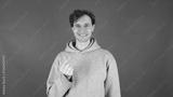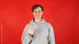 young adult, cheerful, happy, curly haired brunette man in gray hoodie shows heart sign with crossed fingers of one hand in front. Isolated on red background of studio shot. concept - love, sympathy