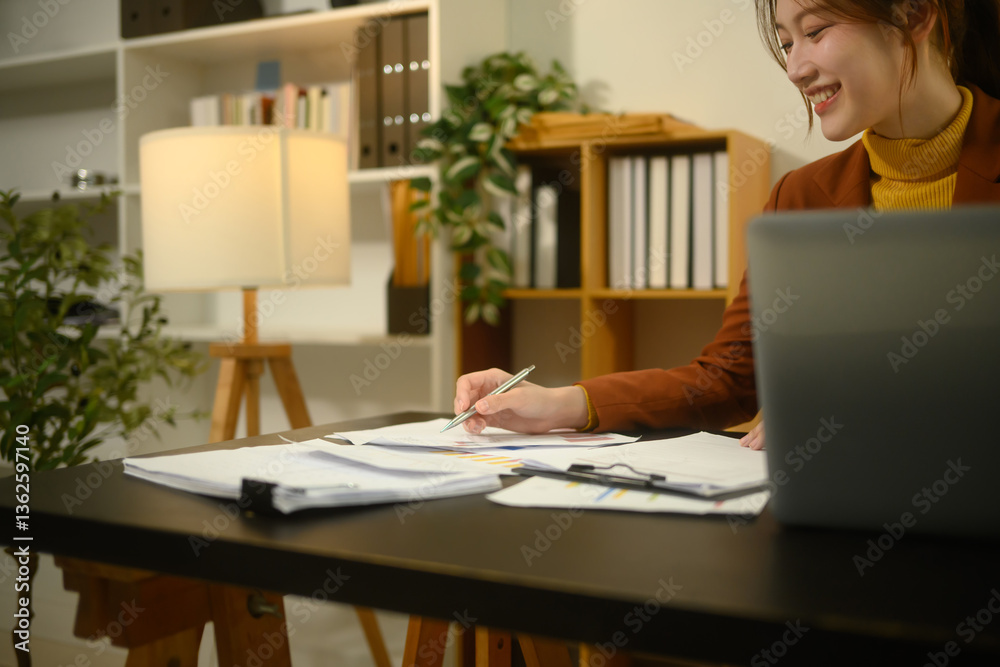 Smiling businesswoman sitting at desk with laptop, reviewing graphs and statistics