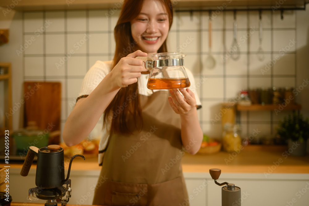 Smiling woman holding a glass carafe filled with freshly brewed coffee, standing in a cozy kitchen