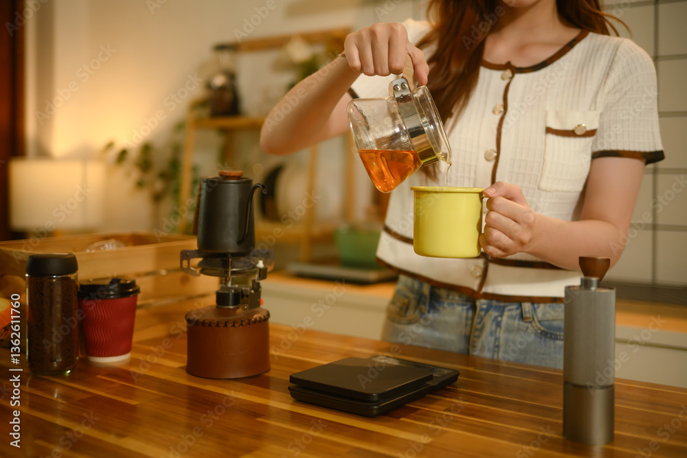 Woman pouring hot coffee from a glass carafe into a mug, standing at kitchen counter