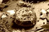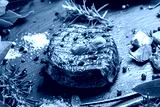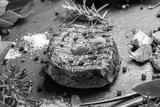 Grilled delicious ribeye steak and some seasonings and herbs on black slate serving plate. Flat lay.