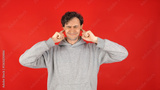 young adult, unhappy, angry, suffering curly man in gray hoodie covers ears with fingers, does not want to listen to screams, loud music, avoids stress. Isolated on red background of studio shot.