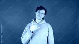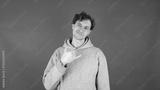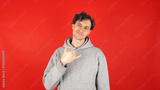 young adult, cheerful, curly haired brunette man in gray hoodie shows sign hand of shaka, jumbo. Isolated on red studio background. concept - greeting, wishing good luck, Hawaii, surfing.