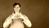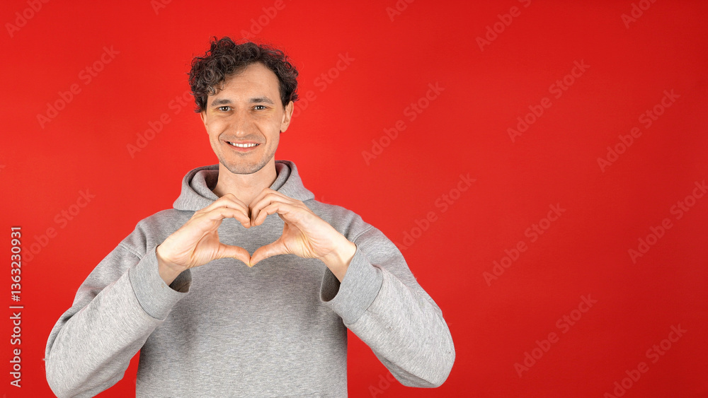 young adult, cheerful, curly haired brunette man in gray hoodie shows shape of heart frame with two hands in front. Isolated on red background of studio shot. Concept - love, sympathy, romance, voting