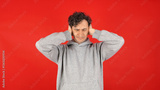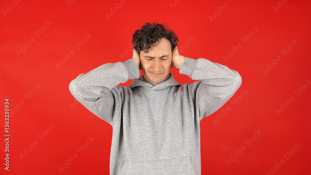 young adult, unhappy, angry, suffering curly man in gray hoodie covers ears with palms, does not want to listen to screams, loud music, avoids stress. Isolated on red background of studio shot.