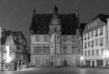 Historic town hall on the illuminated market square in Marburg Germany with surrounding buildings