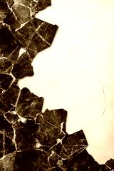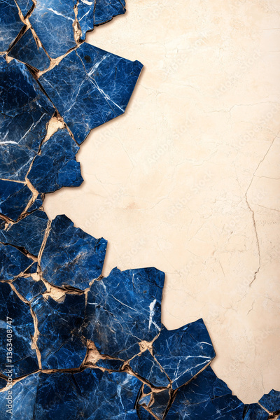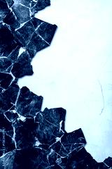 Cracked blue marble tiles with white veins, revealing a beige surface beneath.