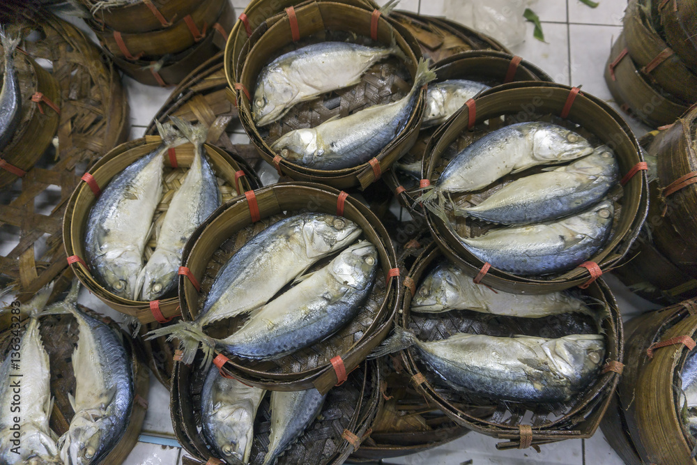 Mackerel fish in bamboo basket