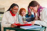 Excited diverse students engaged in collaborative learning while studying together and sharing ideas on homework assignments in a dynamic group setting during their university campus