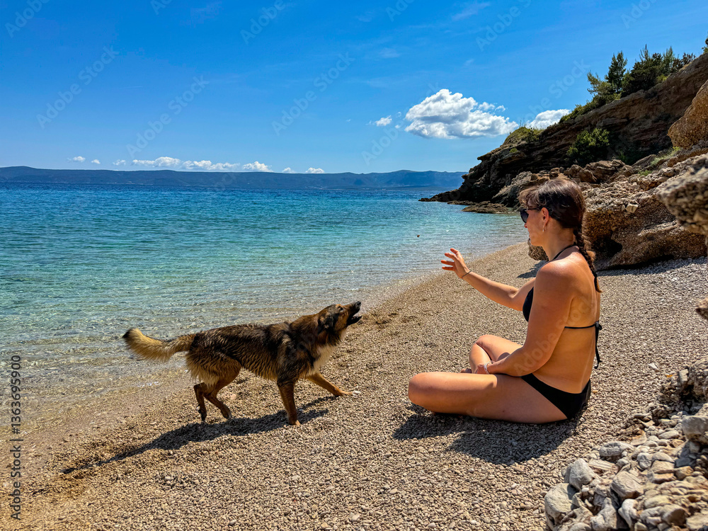 CLOSE UP: Female holidaymaker plays with her wet dog on a sunny pebble shore. Lady in bikini and her shepherd mix having a playful moment on a remote wild beach. Summer holidays on a Croatian island.