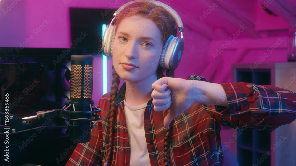 Female teenager girl woman gaming blogger influencer cyber sport gamer play video game computer talk microphone comment online stream esport dissatisfied sad showing thumb down bad dislike addiction